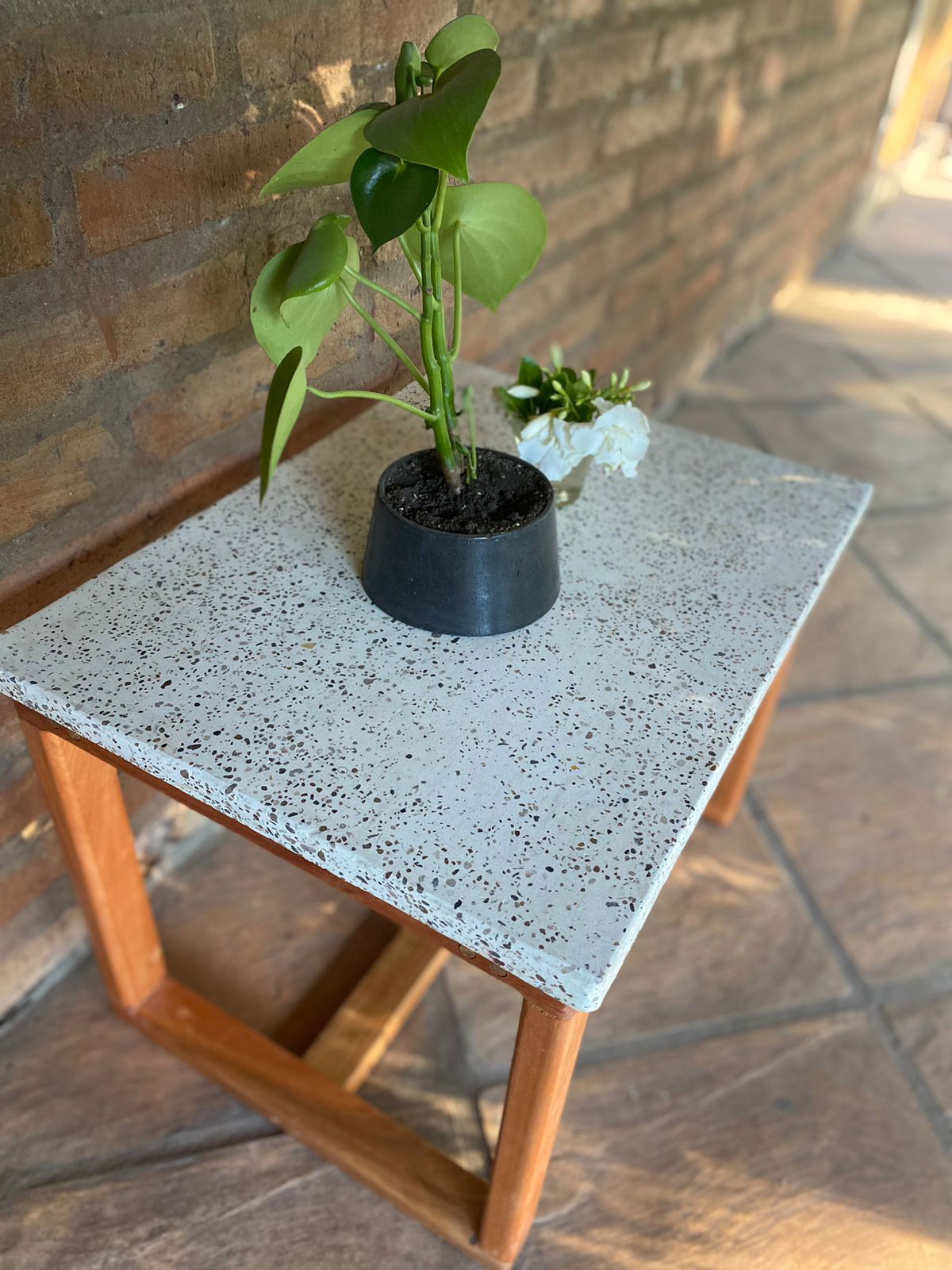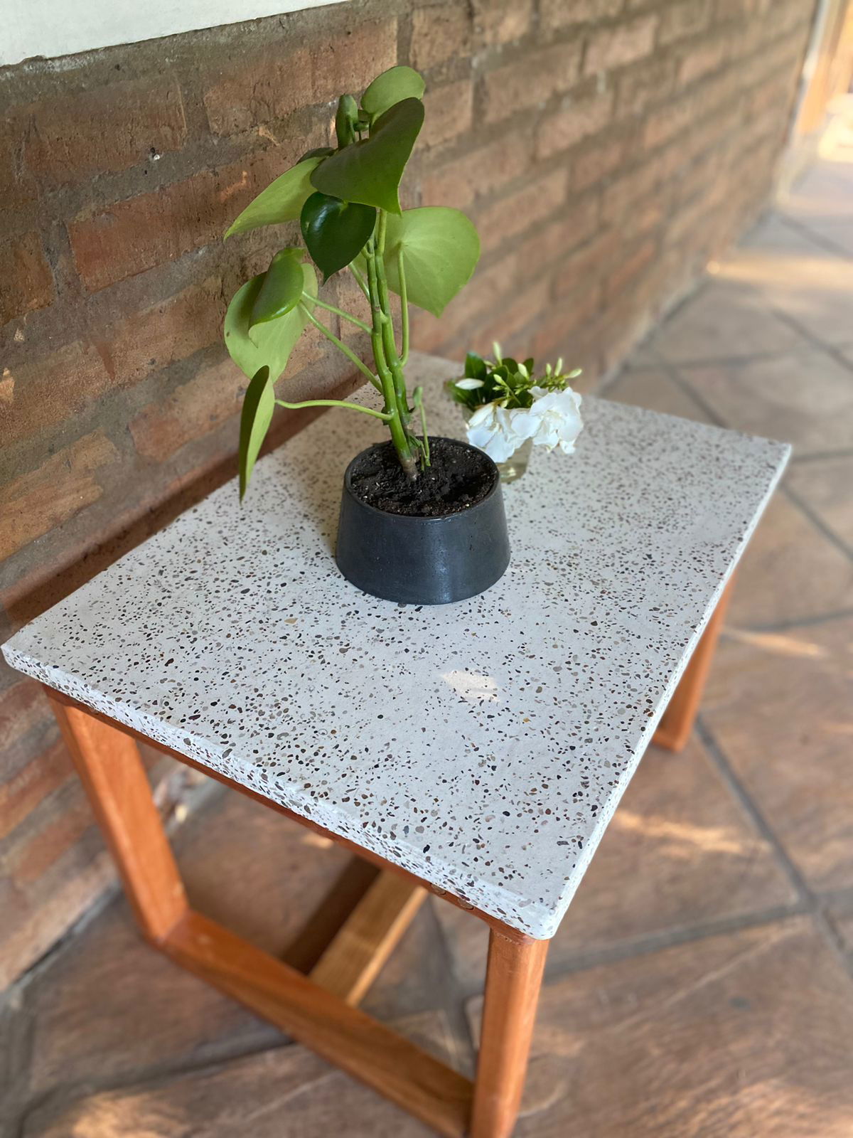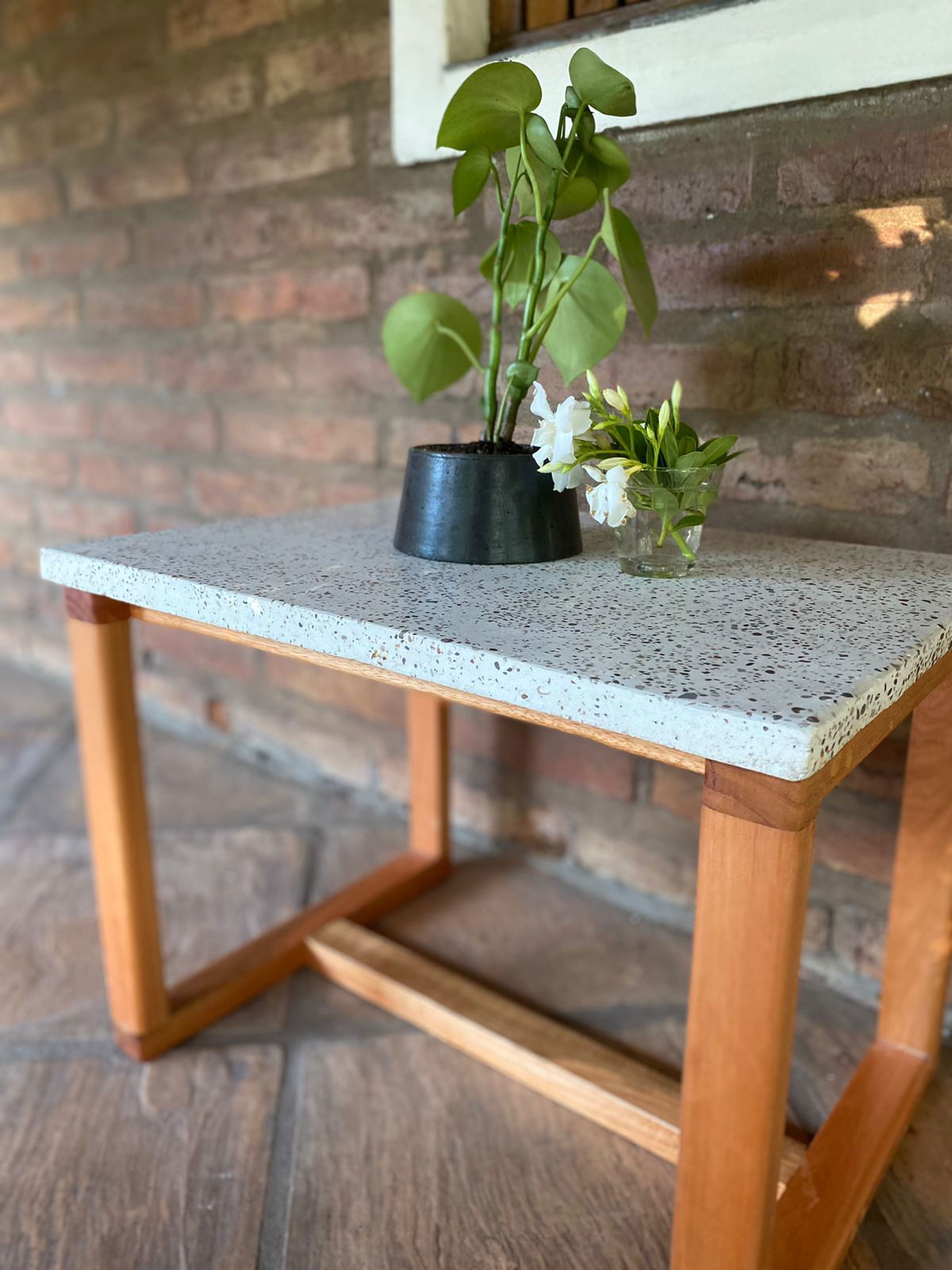 Mesa ratona Mykonos, un modelo versátil que nunca pasa de moda. Tapa de cemento estilo terrazzo con base de madera saligna. Diseño moderno.