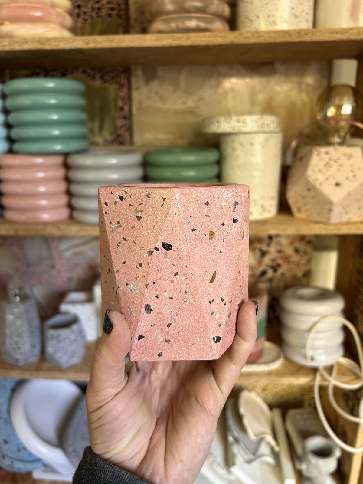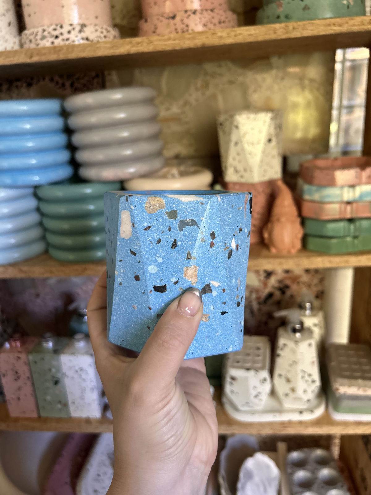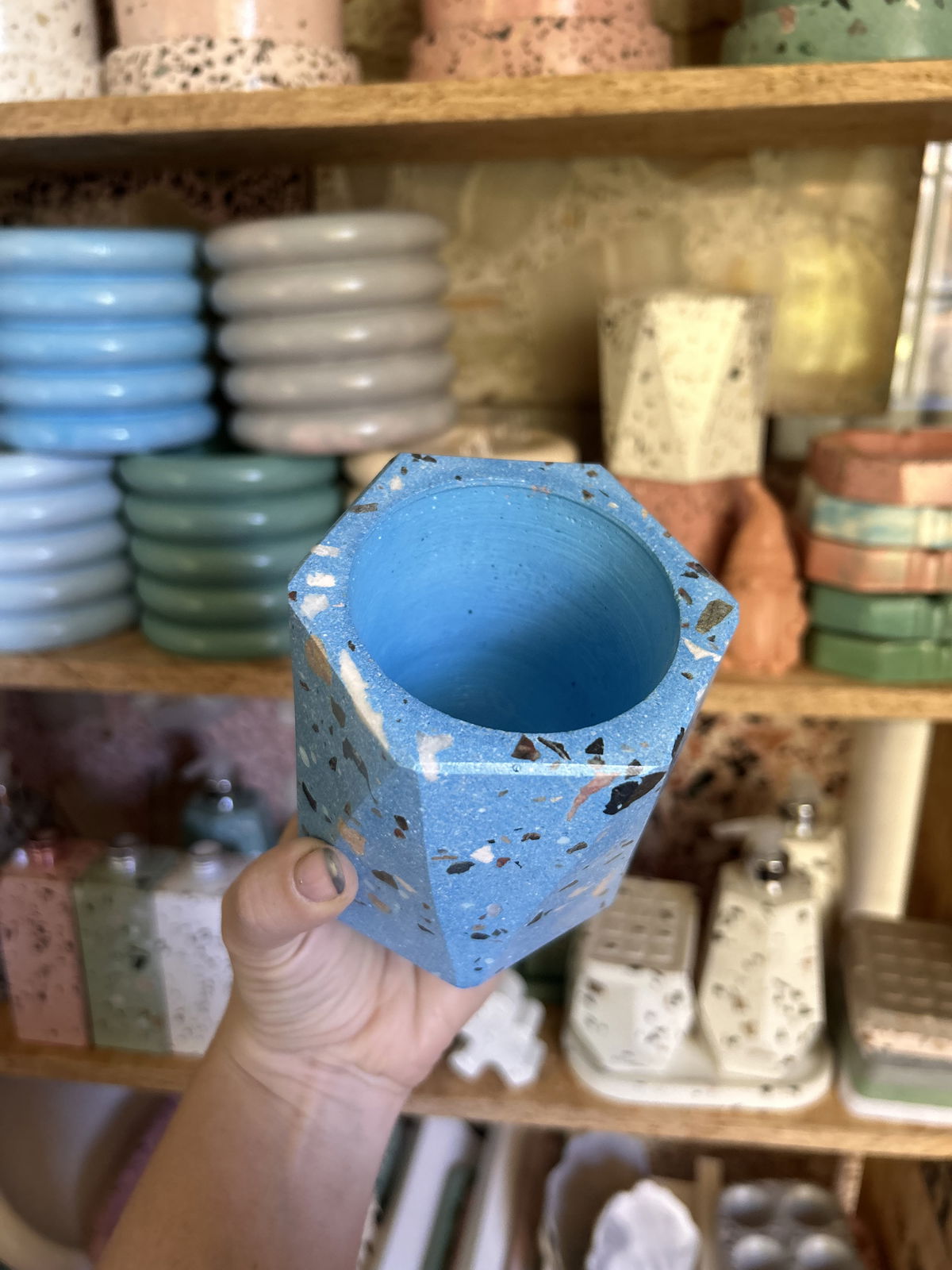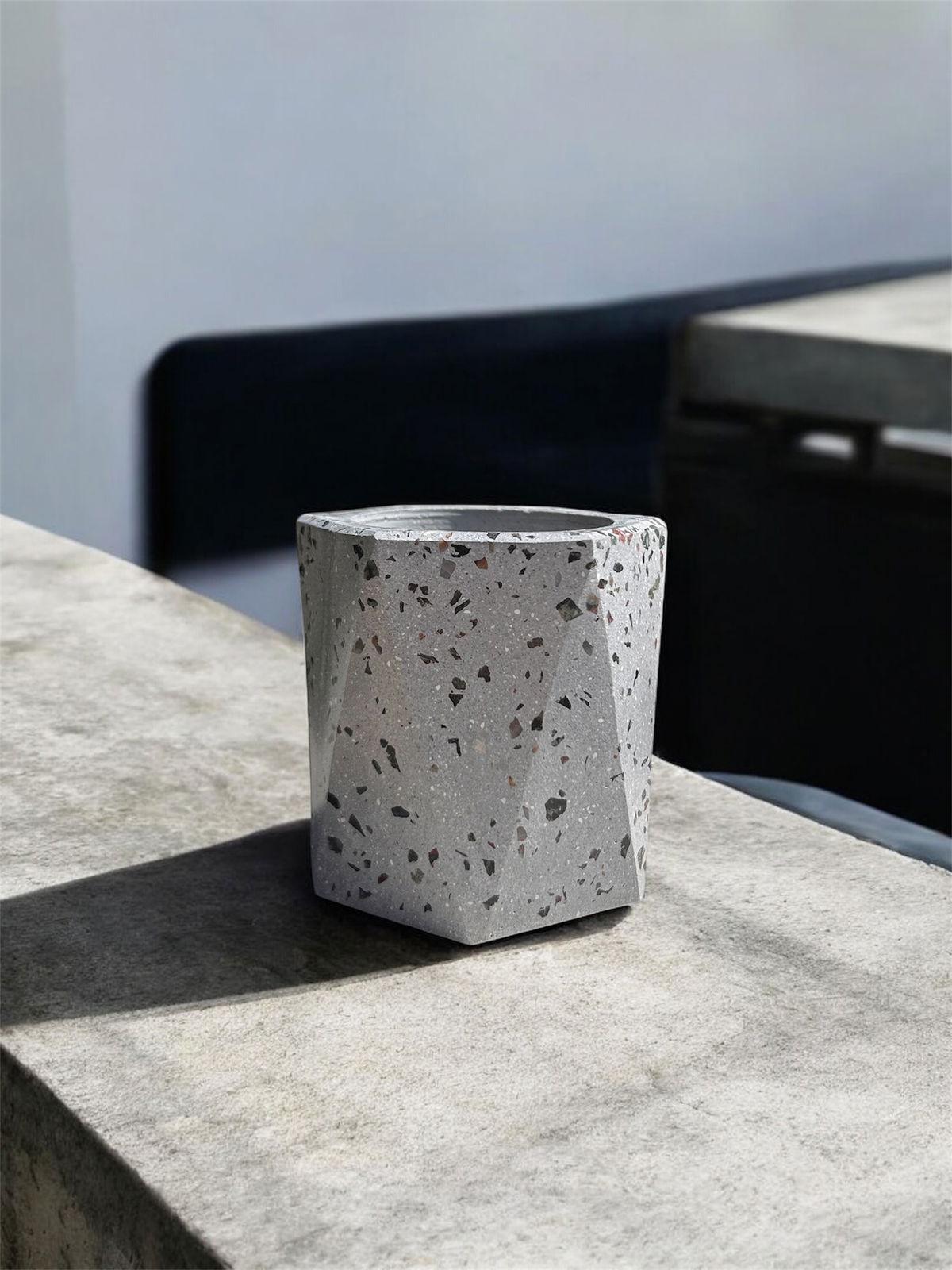 Maceta faceta con blend de piedras naturales- Altura 9.5 CM - Se entrega impermeabilizada y laqueada.